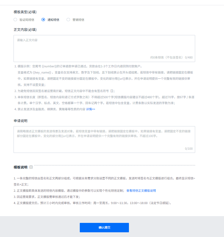 ## 极光短信申请步骤: ### 1.登入极光短信网址 [www.jiguang.cn](http://www.jiguang.cn)极光短信官网,没有账号先点击右上角免费注册一个账号,并把这个账号实名认证,升级到企业认证  ### 2.点击极光短信模块,去配置  ### 3.配置短信签名和模块管理   创建模板(1个) 模板类型:通知短信 正文内容: 您好,变电所[{{substationname}}]在[{{happentime}}]发生{{eventtype}}事件,具体内容为:{{content}} 申请说明: 企业业务需要,通过云控制平台监控设备用电情况,设备异常发送报警短信 配置完成之后,点击底下提交,等待审核,审核完成之后,审核状态变成已通过  ### 4.点击右上角头像 -> 账户信息 ,获取记录账户DevKey、API DevSecret   ### 5.返回到主页面,点击右上角的头像 -> 点击工作台 -> 应用管理  点击右上方创建应用,创建完应用之后,获取短信密钥:AppKey、Master Secre    ### 6.收集整理信息整理信息提供给予我司工程人员 * 账号信息****AccessKey****、****AccessSecret**** * ****签名名称**** * 全部模板名称及****模板CODE****  ### 7. 远程设置 注:非我司技术人员非必要请勿操作; 1)远程应用服务器,登录接收程序设置短信界面 2)勾选:启动短信服务,设置为极光短信 3)按以上信息录入,并且保存。 4)通过右上角测试手机号测试对应报警信息是否正常。 5)重启接收程序生效。 **** 信息结构(签名+内容)  变电站绑定手机号:只发送本变配电站的报警短信,运行手机号是发送遥测和遥信报警;运行状态手机号发送网关或者仪表在线、离线报警